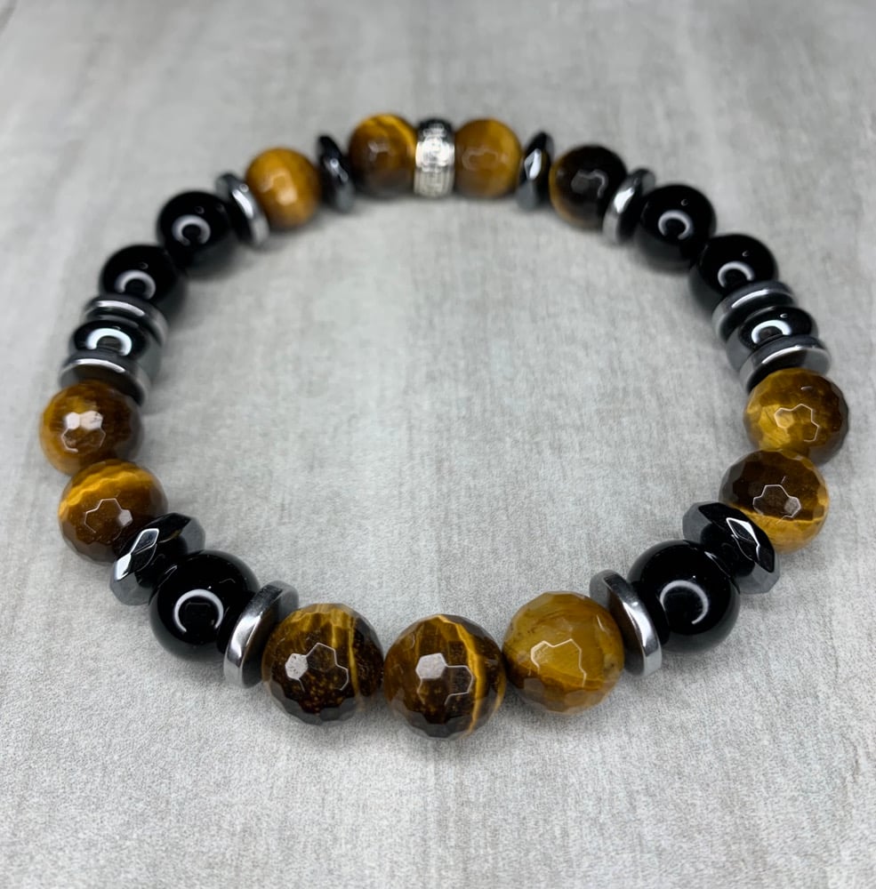 Crafted with smooth black onyx, faceted dark golden tiger eye, and bold hematite beads, Clarity delivers a clean, structured look with striking contrast. The faceted cut adds dimension and subtle light-catching detail, giving the bracelet a refined edge.