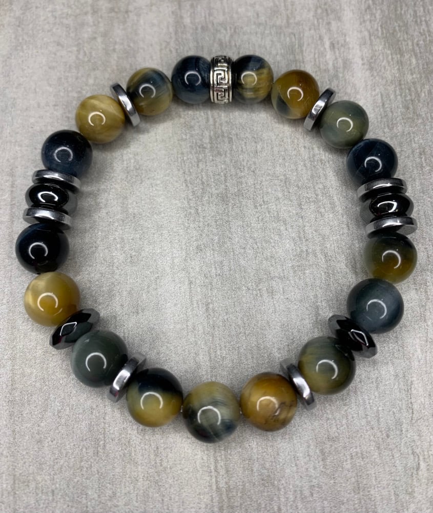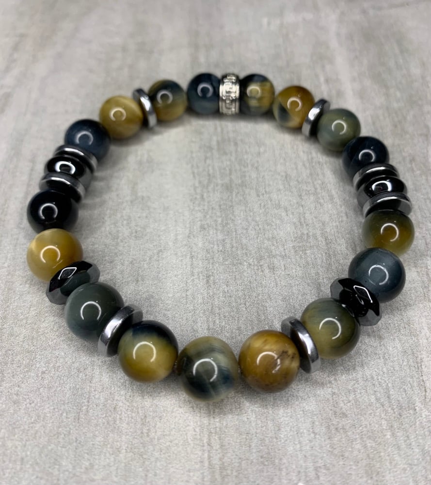 Crafted with blended tiger eye beads in shades of blue, gray, and gold, accented with bold hematite, Confidence delivers depth, contrast, and modern appeal. The layered tones create a multidimensional finish that stands out with confident simplicity.